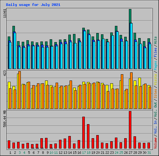 | Day | Hits | Files | Pages | Visits | Sites | Volume | Vol. In | Vol. Out | ||||||||